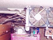 Hier sieht man den Rechner, wie er jetzt aufgebaut ist. Im Hintergrund sieht man den Radiator, mit den 3 Lüftern. Dies sind Lüfter mit einem Potentiomenter zur Einstellung der Geschwindigkeit. Diese Potentiomenter sind auf die langsamste Stufe eingestellt.